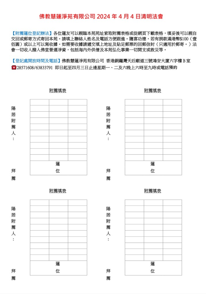 2024年清明法會 2024年清明法會將於4月4日舉行。 2024年4月4日清明法會。 有需要的蓮友可以利用以下的表格,登記「附薦蓮位」。 聯絡我們 回主頁 分享此文: 分享到 X(在新視窗中開啟) X 分享到 Facebook(在新視窗中開啟) Facebook 分享到 WhatsApp(在新視窗中開啟) WhatsApp 列印(在新視窗中開啟) 列印 分享到 Telegram(在新視窗中開啟) Telegram 以電子郵件將連結傳送給朋友(在新視窗中開啟) 電子郵件 喜歡 正在載入...